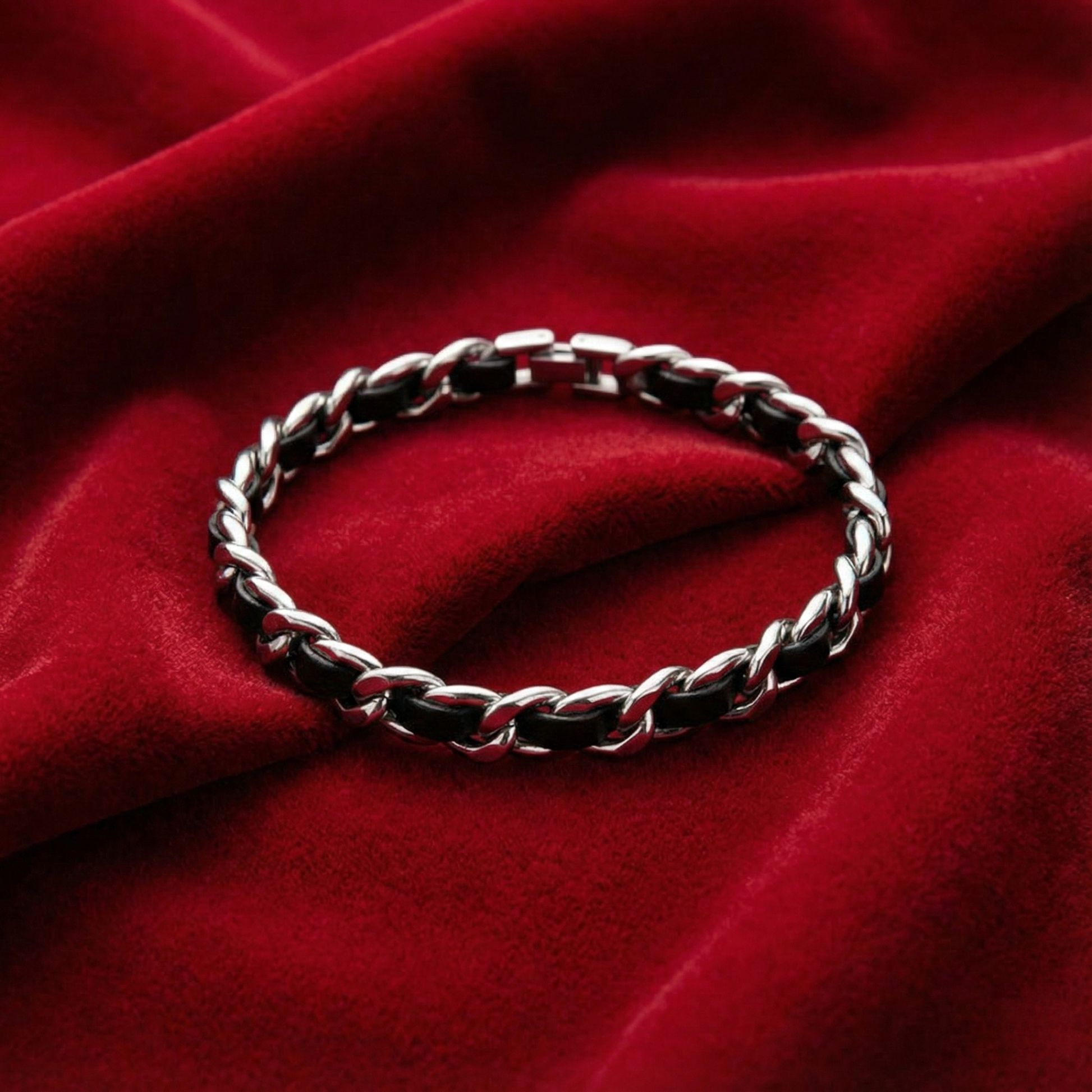 In the silent heart of the night, when the world holds its breath, the Shadowlink Bracelet was forged. Each link carries the duality of darkness and steel—polished silver reflections wrapped around a deep, shadowed core. It is said that the bracelet was inspired by the chains of ancient guardians, those who walked unseen but were feared by all who sensed their presence.