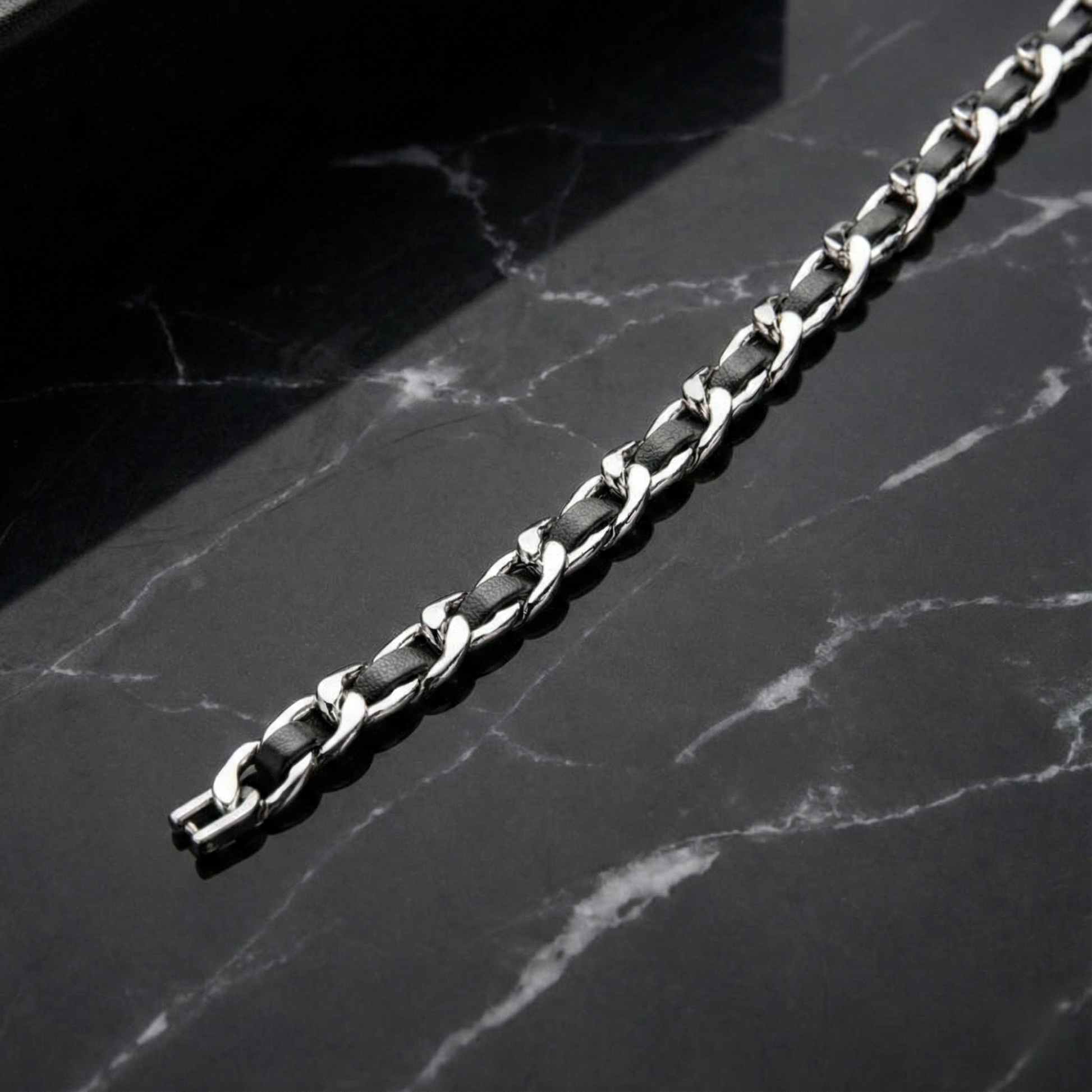 • Design: Dual-tone chain weave combining polished steel links with a dark shadow-core for a bold, dominant aesthetic.